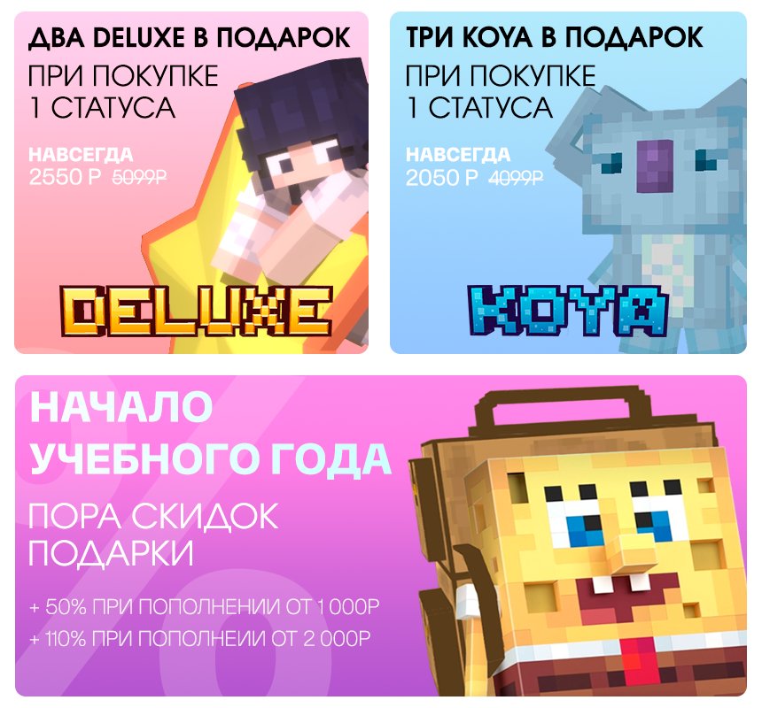 https://vk.com/lemoncraftsborcaserverov Только до 7 сентября! Успей приобрести крутые привилегии со скидкой до 50% и получи подарки!—> При пополнении от 1 000р, бонус +50% в подарок